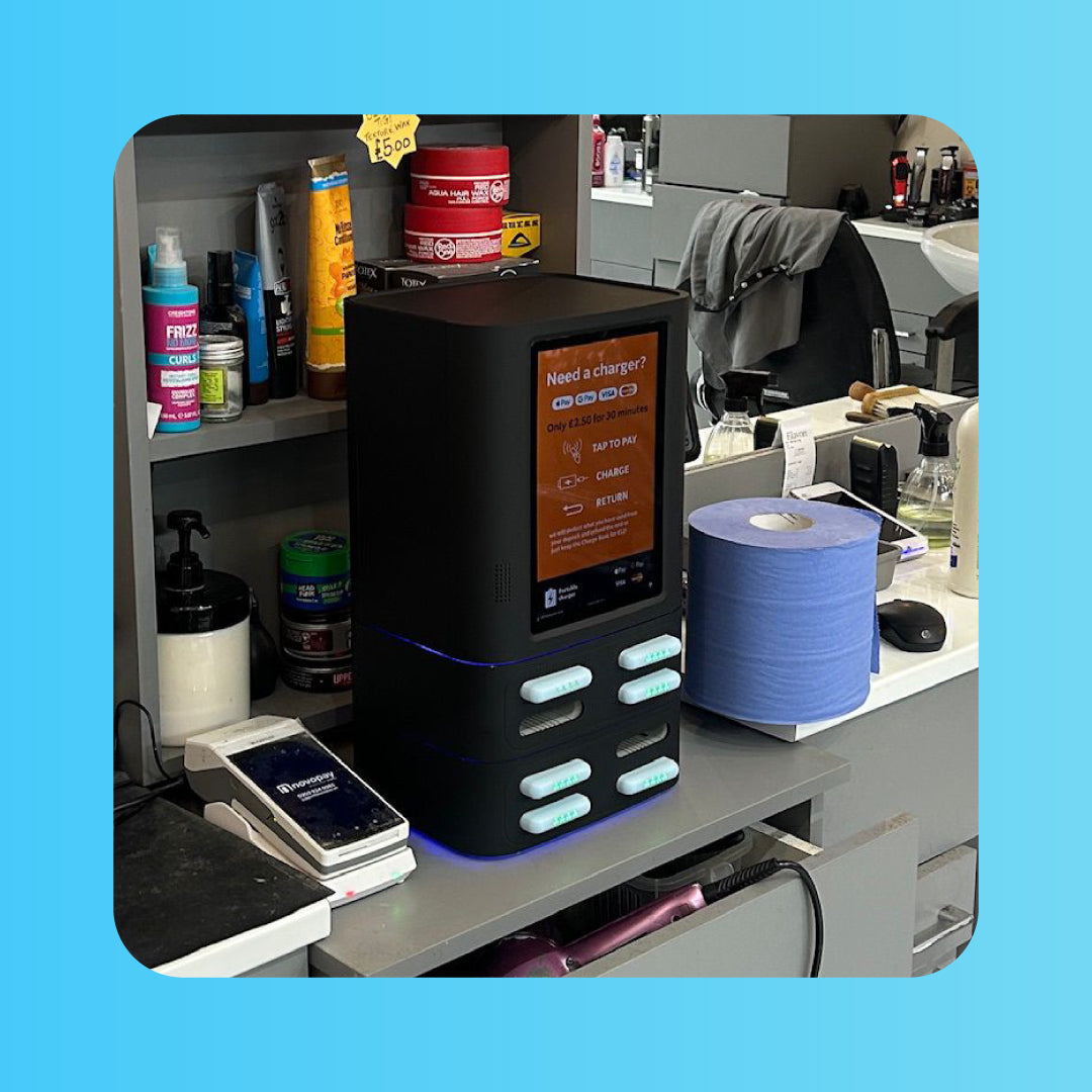 Our charging stations offer multiple charging options, where you can connect and charge your mobile device. Each of our power banks has an integrated USB-C, Lightning, and Micro-USB port. Usage is simple and convenient through our mobile app.